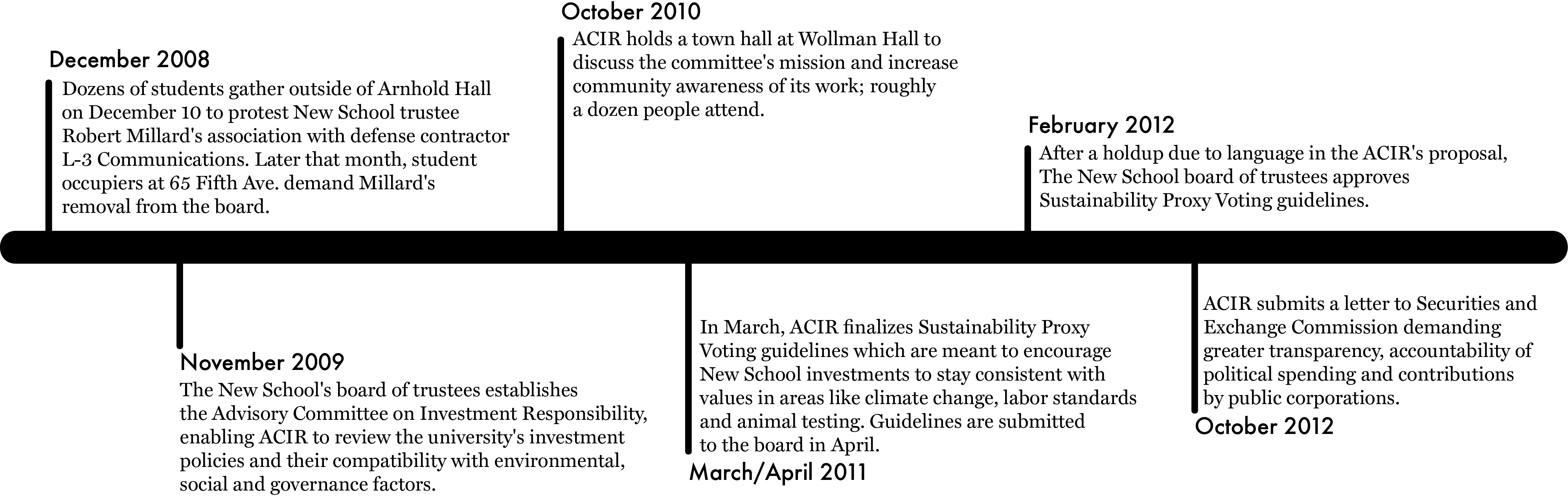 The ACIR’s journey began when dozens of students gathered outside of Arnhold Hall on December 10, 2008, to protest New School trustee Robert Millard’s association with defense contractor L-3 Communications. Millard’s position on L-3’s board of directors left students and faculty concerned about The New School’s ties to a company whose activities appeared to go against the very fabric of the university’s values. One week later, many of those same students staged an occupation at The New School’s 65 Fifth Ave. building. Besides demanding that then-President Bob Kerrey and then-Vice President James Murtha step down, their conditions also called for Millard’s removal from L-3’s board.