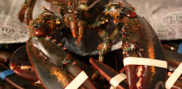Live American Lobsters are kept in cardboard boxes and covered with newsprint next to the JMS Seafood Company stall (Lindsey Peters)