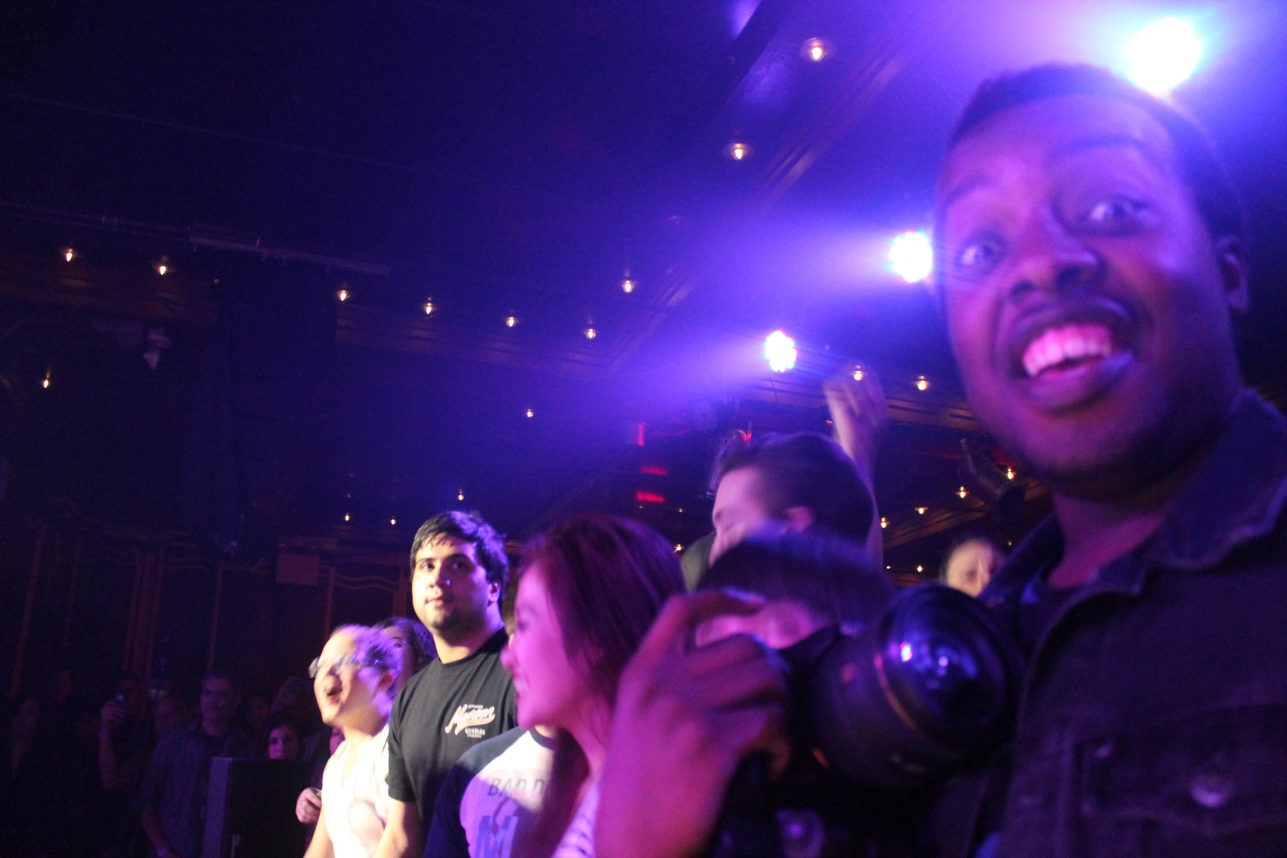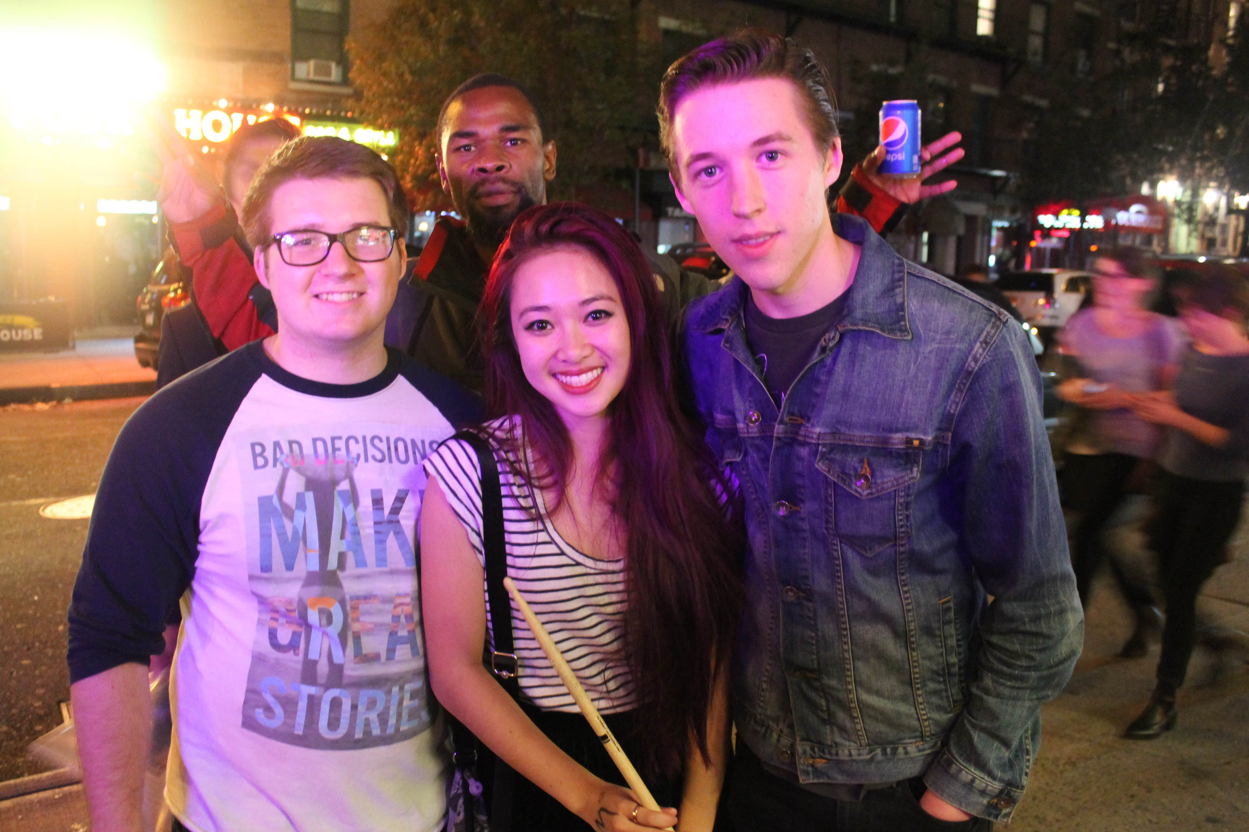 NYU student Tiffany Tang (center) caught one of Thatcher’s drumsticks he threw to the crowd at the end of the concert. Sarah Lawrence students Nick Ransom (left) and John David Crosby (right) met Tang in line and they hung out during the show.